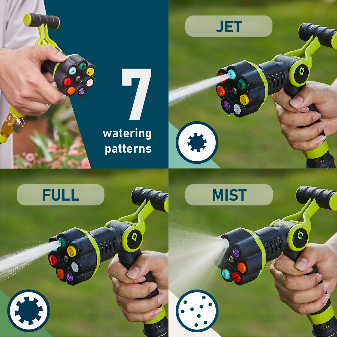 Designed to meet all your watering needs. 7 patterns for water, jet, shower, flat, full, mist, cone, and center. Easily identified and suitable for various garden watering needs.